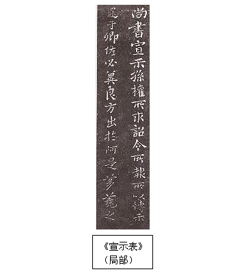 《宣示表》在章法上的独特性也使得它与其他作品拉开了距离。在隶书中奉为规律的“纵成行,横有列”,在该帖里已变成—厂“纵有行,横无列”。在《贺捷表》、《荐季直表》等帖中,字与字之间还有着较大的距离,而在这里已是字距几乎消除,上一字与下一字之间因势生形、因形生姿,在纵向上显得格外茂密,全篇上也避免了“平直相似,状若算子,上下方整,前后齐平”,因而有—种质朴自然之美。这也正是明、清两代颇耗“功夫”的“馆阁体”终不及之的重要原因。总之,学写小楷,因力在于指腕之间,故不必—定要高悬手腕,因为小楷每字亦只二三分见方,笔势有限。另一方面,小楷沉着端重,用笔精致细腻,要悬肘作字,于初学者来说,实在难于控制和驾驭,故初学小楷,不宜高悬手腕。一般可采用提腕的方法,即肘着桌面,虚提其腕,与桌面保持一种若即若离的状态,这样既能有效地控制和驾驭手中之笔,又能使腕部圆活地转动,笔力和笔势也能得到充分的发挥。