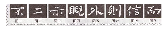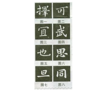 (七)折画是两种笔画的交接。折应写得方劲雄强。如图七“旦”字的折画,其写法是先写横,至折角时,用腕微向右上方翻动,将锋提至横画的右上角,然后迅速于纸面上侧势—翻,使锋面由阴面翻到阳面。翻笔时锋尖于纸上作暗圈,动作要爽利快捷轻灵。翻笔实际上就是使横竖二笔吻合得自然,以不露痕迹为上。小楷的折法,其整个动作是极其微小的,动作也是在极短的一瞬间完成,有时完全只是凭自己手腕中的一种感觉。同时,小楷的折法不可太显露棱角,宜含蓄一些。《宣示表》中的折有直折而下,如图八“同”字,也有倾斜的,书写时应注意笔势。