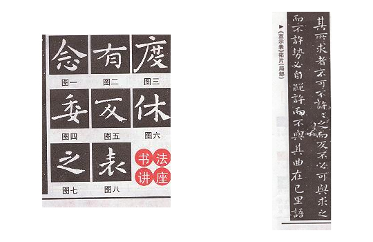 4.反捺。其写法是尖锋入纸,再向右下行笔,渐行渐按,至收笔时稍顿后反折回锋收笔。如图八“表”字的反捺。