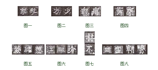 图六“其”字,第一个“其”,笔画圆劲,少圭角,厚重自然;第二个“其”长横尽情张扬,似隶书的“燕尾”笔法,最后两点相背,取横向笔势,与两个长横笔势和谐统一,字形呈倒立梯形;第三个“其”更像成熟的楷书结体,最后两点成“八”字形,用笔技法娴熟,结体自然。